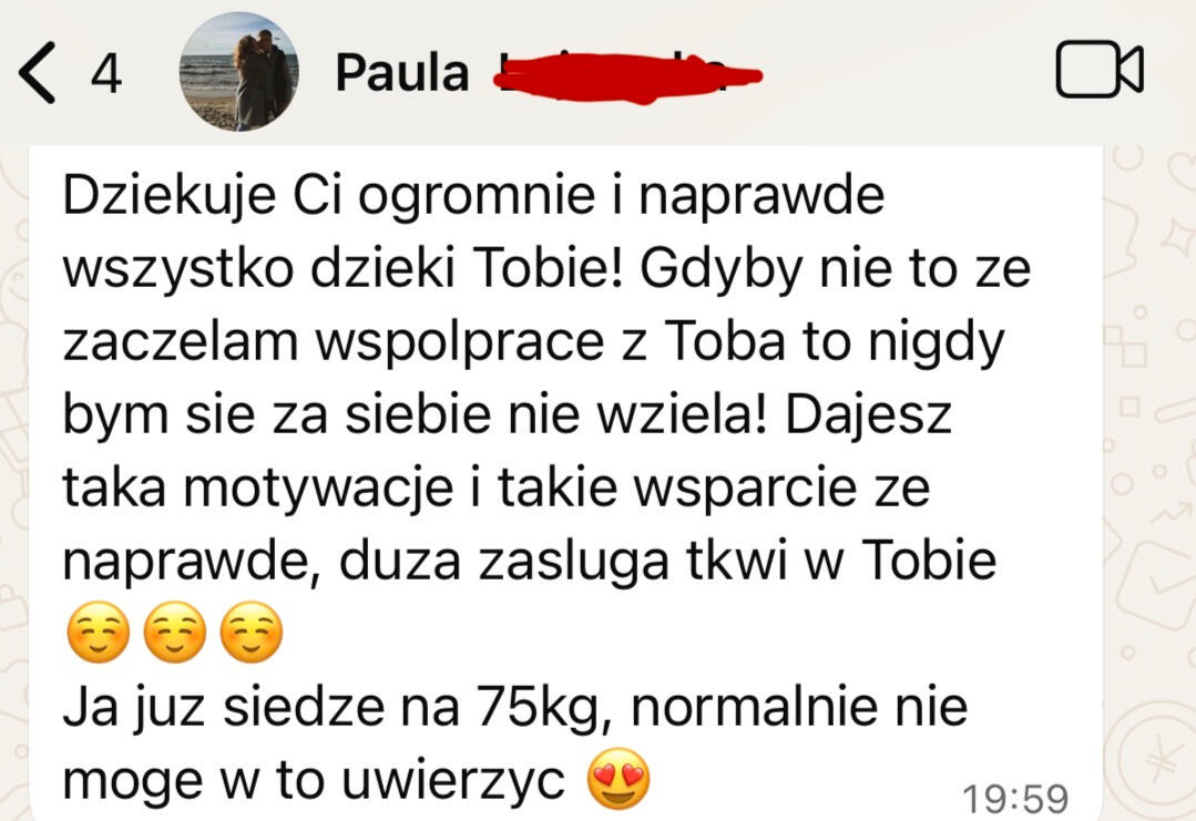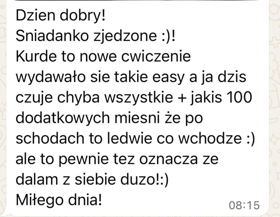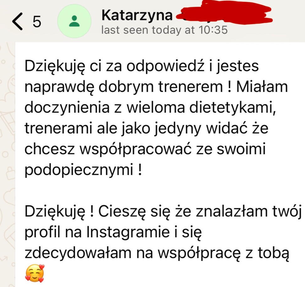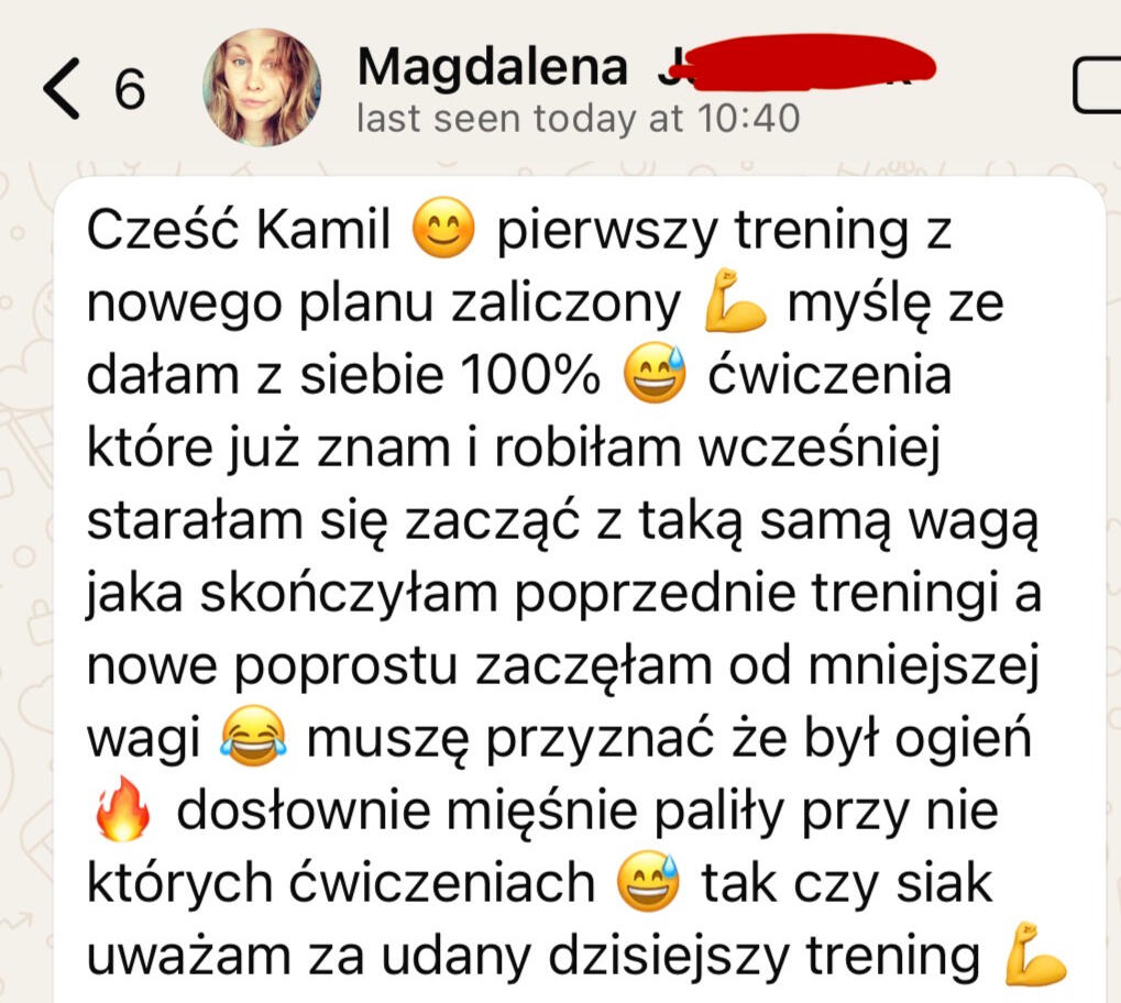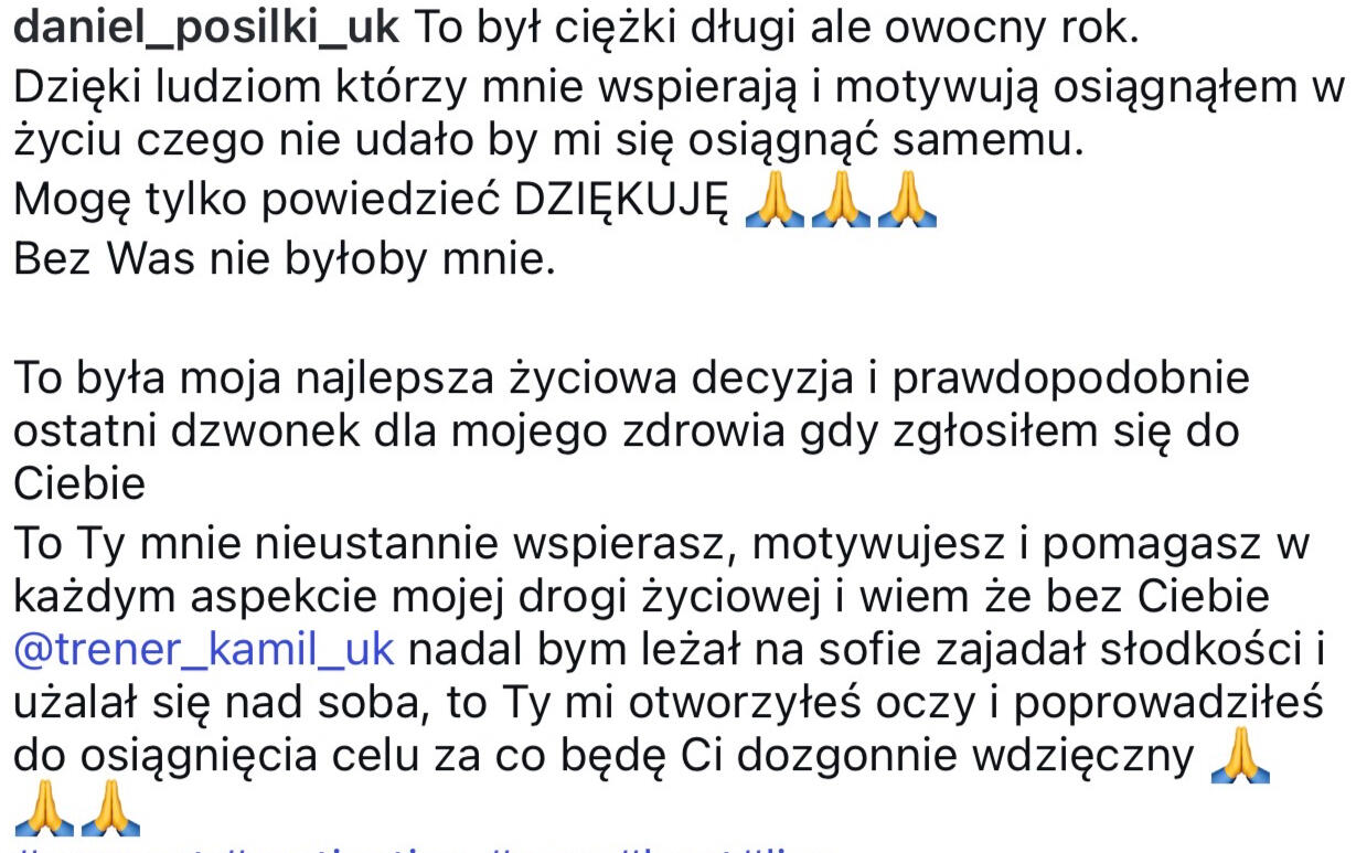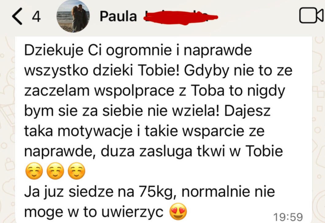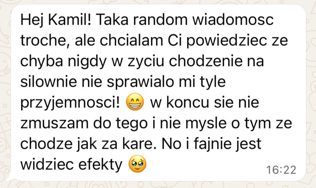 • Znam i rozumiem realia życia w UK z własnego doświaczenia oraz pracy z klientami• Spędziłem tysiące godzin trenując klientów 1 na 1, zdobywając doświadczenie praktyczne. Coś, czego większości trenerów online brakuje.• Pomogłem dziesiątkom Polek zmienić ich sylwetkę• Znam trudności pracy zmianowej, nadgodzin i napiętego grafiku, a także wiem, czym charakteryzują się różne zawody i jak pogodzić je z treningiem i dietą• Uczę krok po kroku, jak tworzyć trwałe nawyki i styl życia, który daje efekty na lata• Motywuję i wspieram na każdym kroku, bo wiem, jak łatwo zniechęcić się żyjąc za granicą