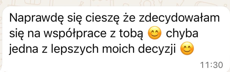 • Znam wartość swojej pracy• Moje klientki osiągają niesamowite efekty• Regularnie dostaje pozytywne wiadomości na temat współpracy ze mną• Nie interesuje mnie współpraca „na siłę”